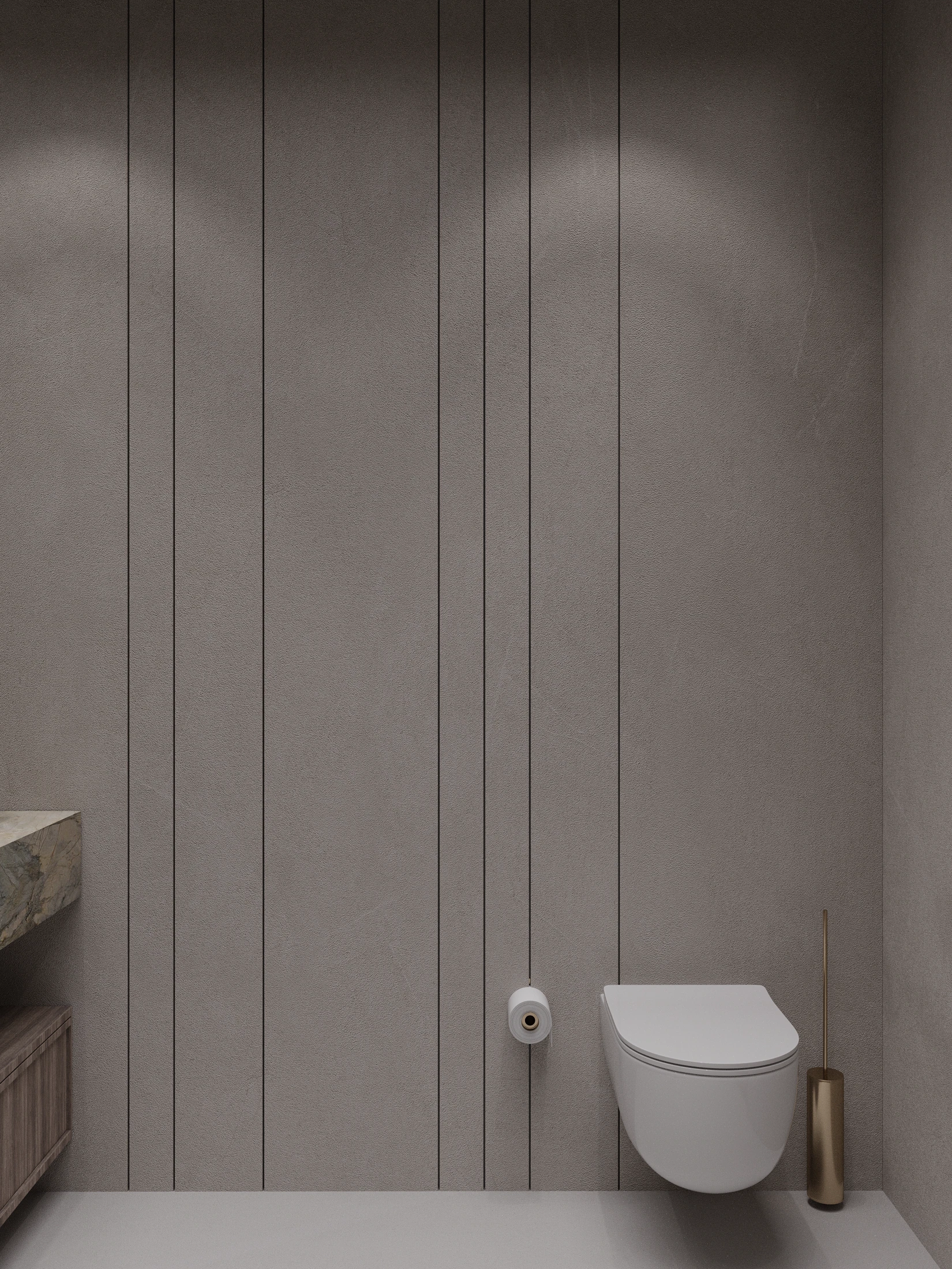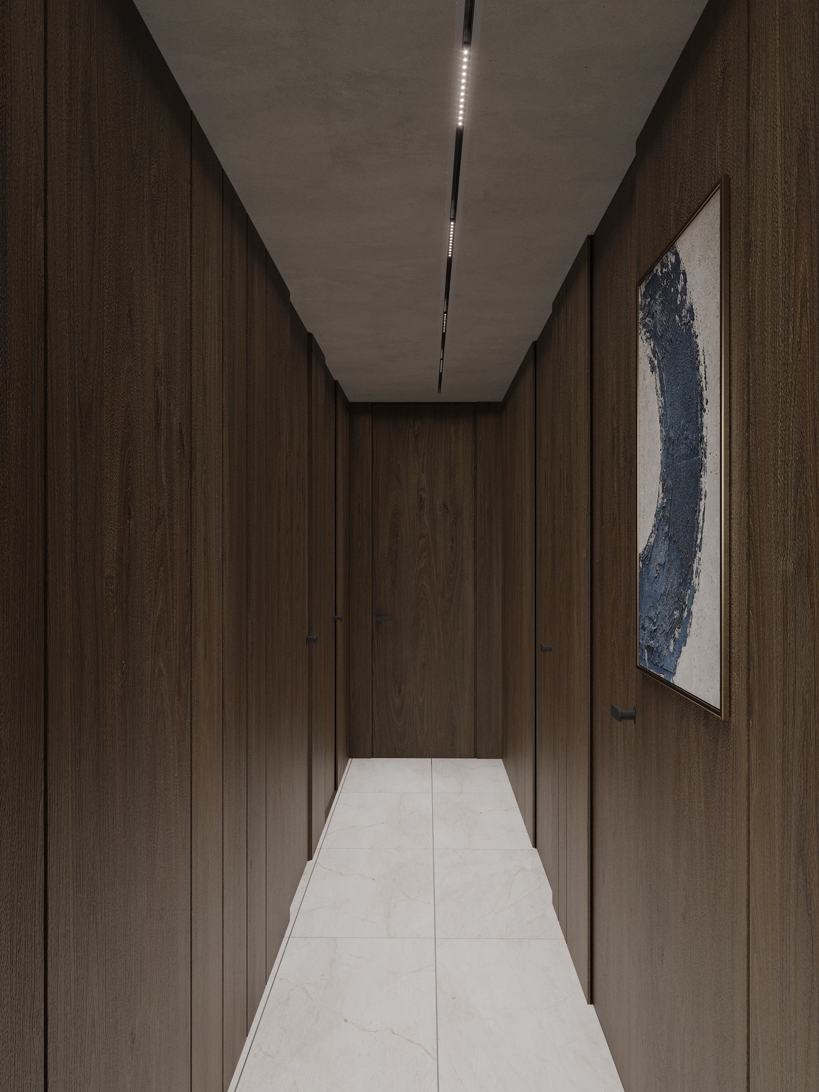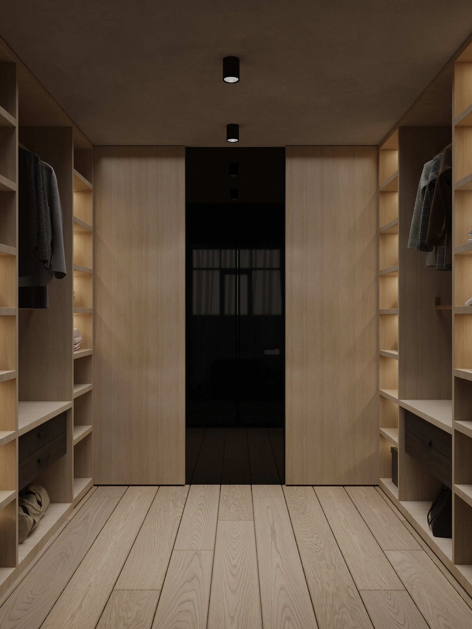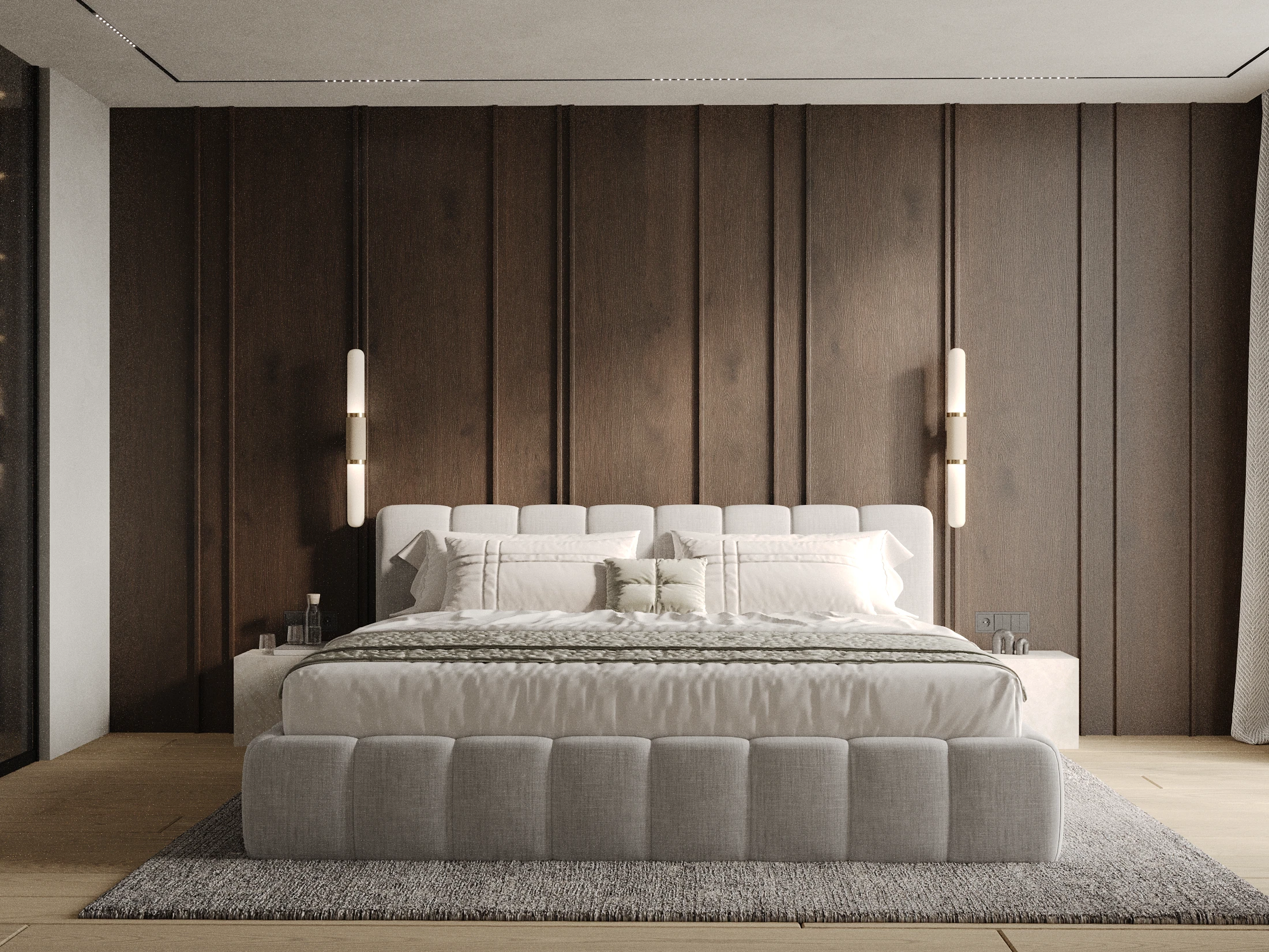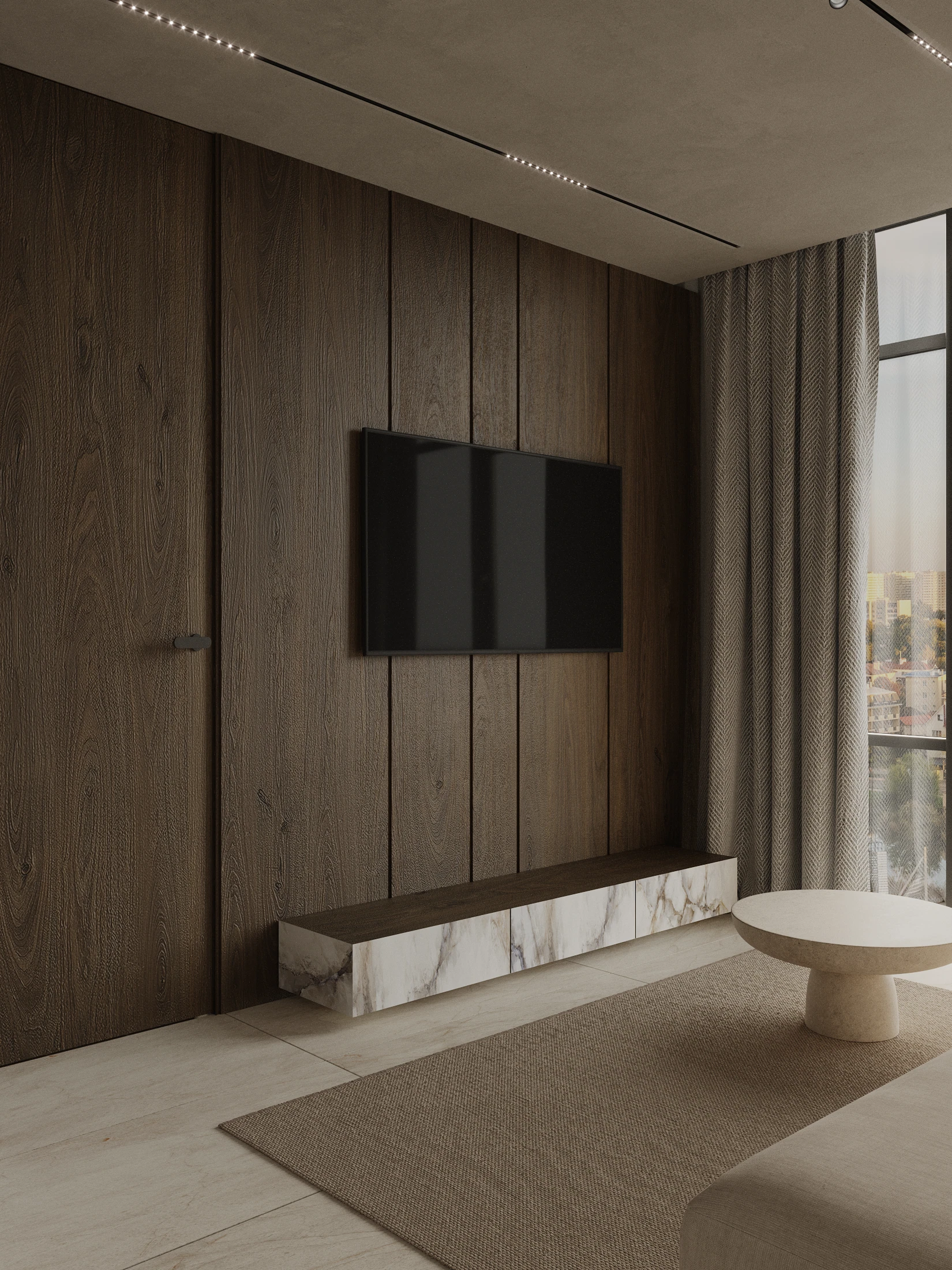 A warm residential interior built around natural wood textures and soft architectural lighting. Vertical panels, minimal forms and balanced proportions create a quiet and intimate atmosphere focused on comfort and calm living.