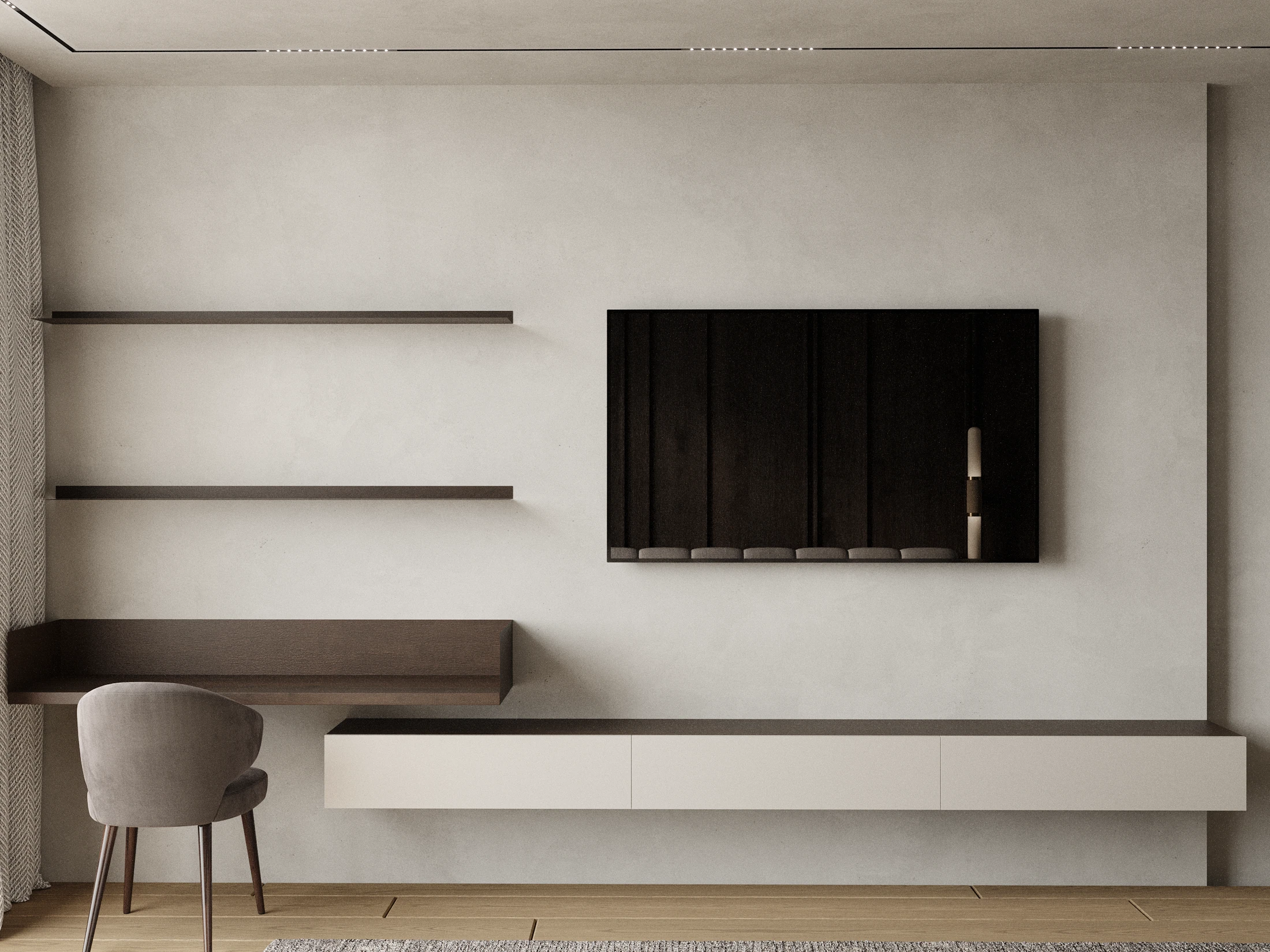 The composition focuses on balance and restraint, where every element serves a purpose. By reducing visual noise and emphasizing proportion, the interior creates an intimate environment that supports comfort, stillness, and a slower, more mindful way of living.