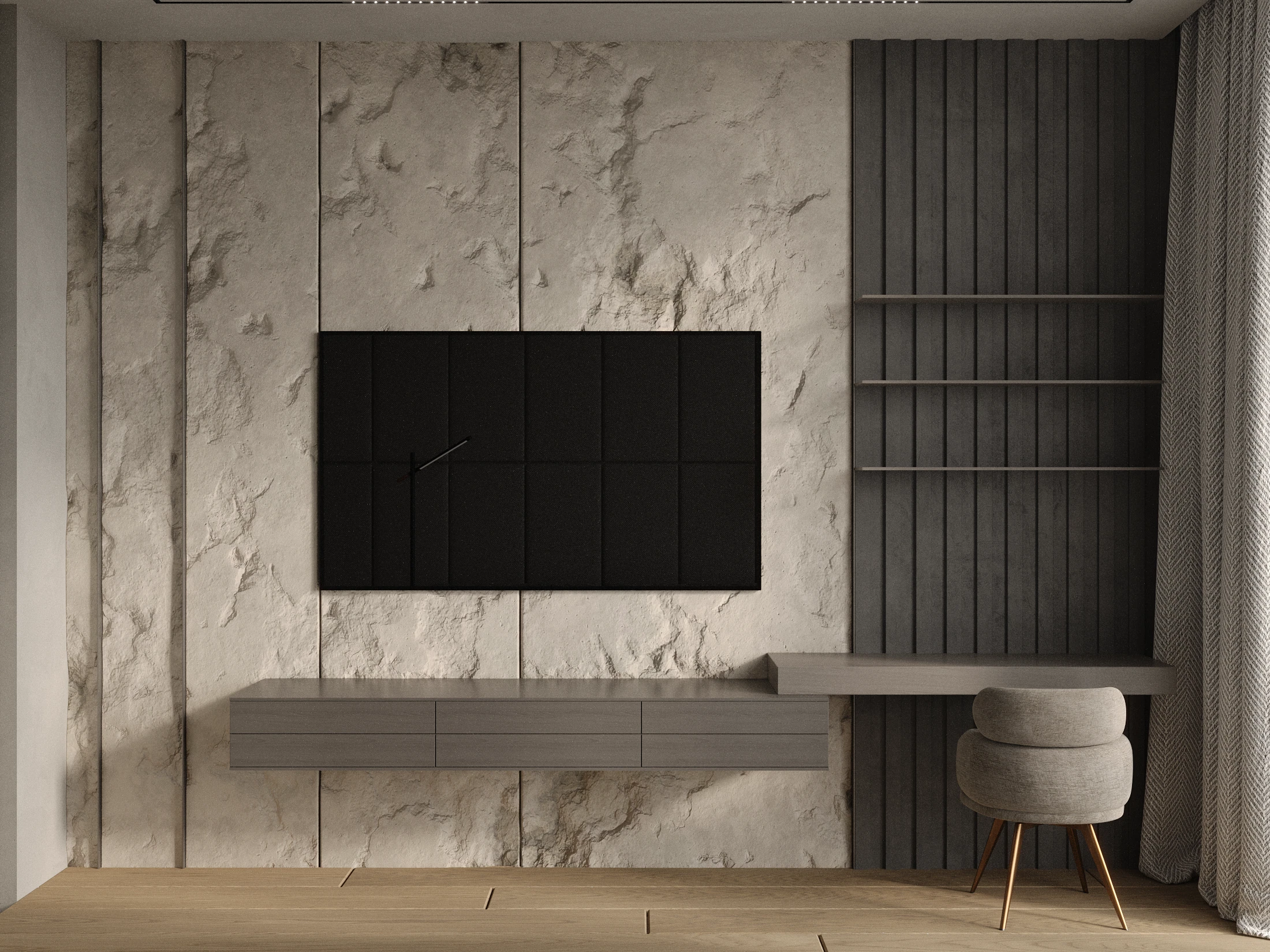 “Inner Silence” is a residential interior concept designed as a calm retreat within an urban environment. The space is built around natural wood textures, vertical panels, and minimal forms, creating a sense of order, warmth, and visual clarity. Soft architectural lighting enhances the atmosphere, replacing harsh contrasts with a gentle, diffused glow
